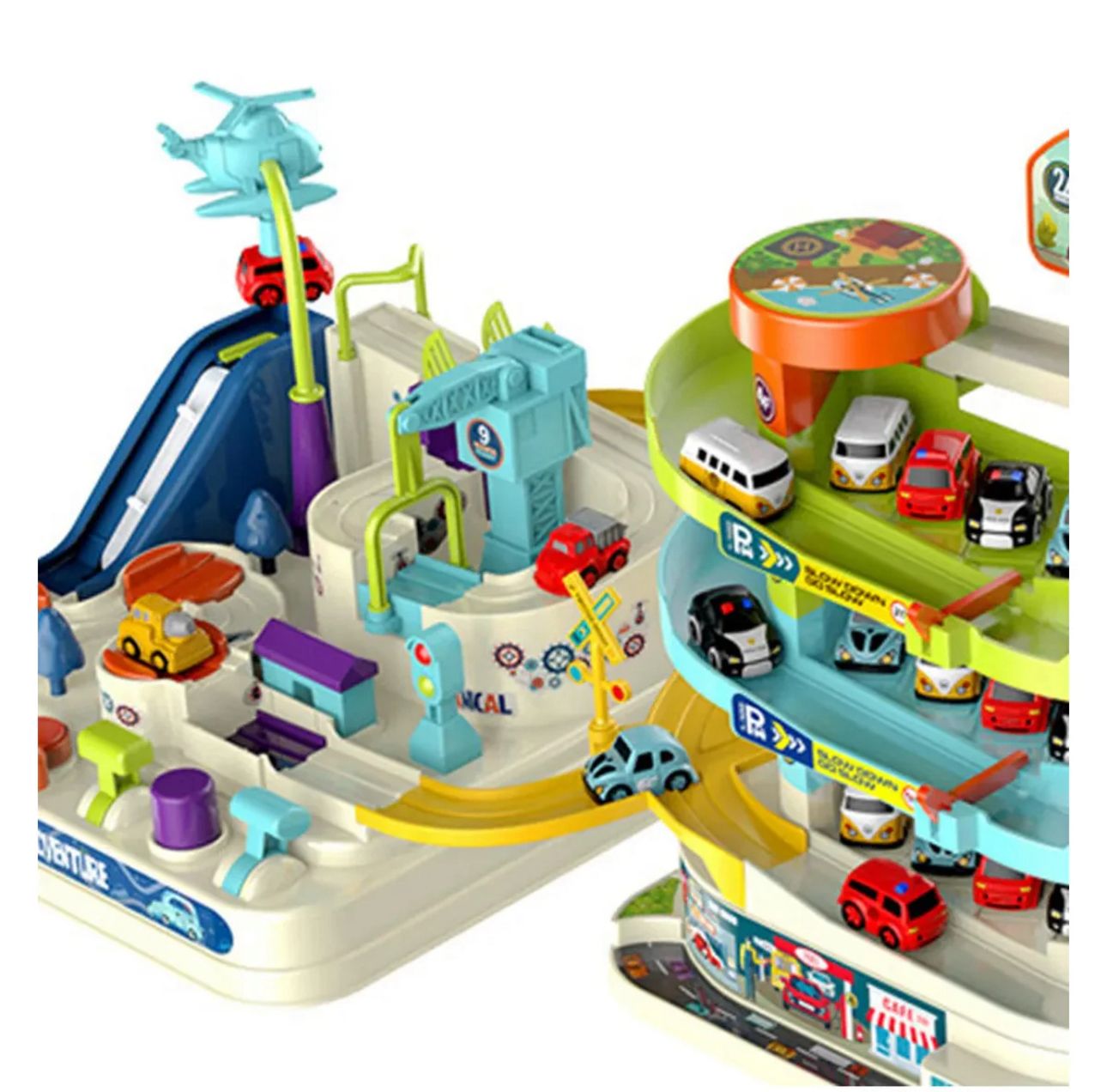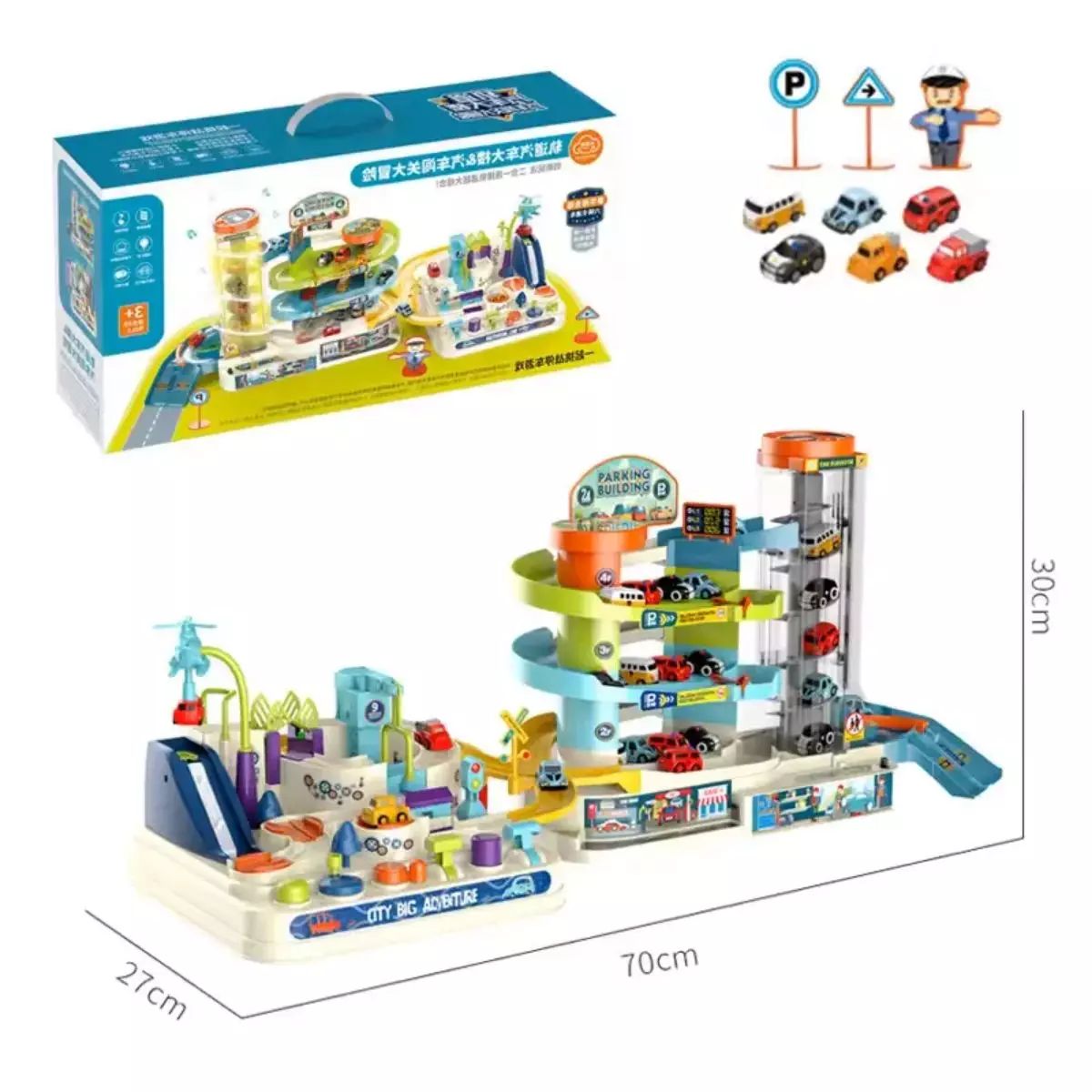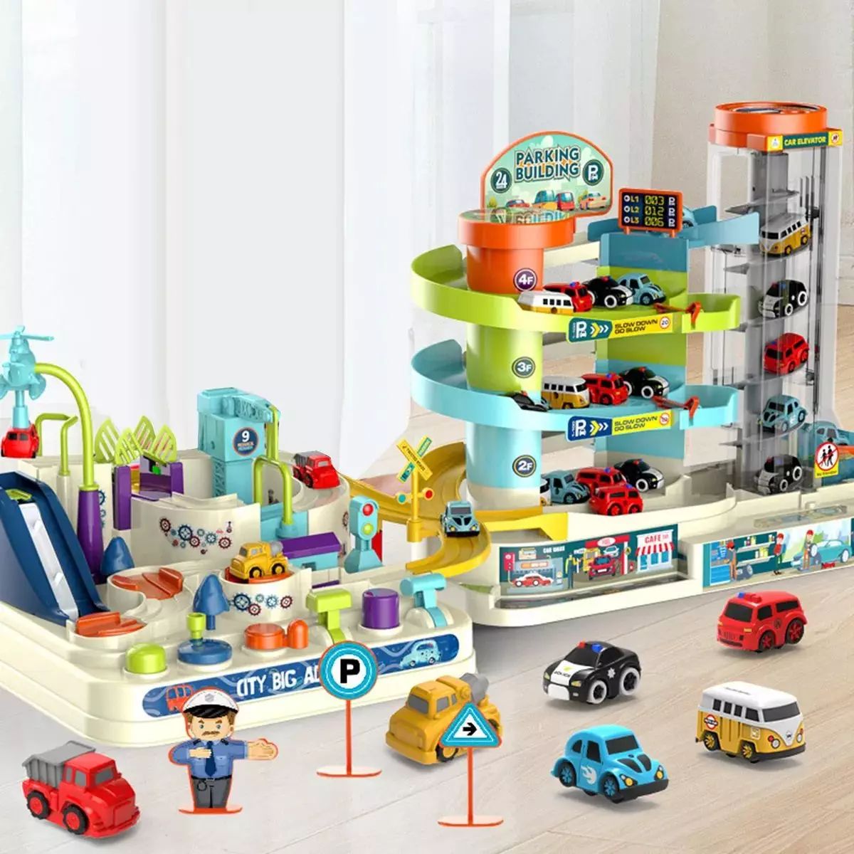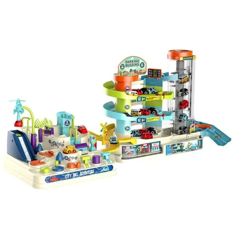 Un set completo que permite armar una ciudad en miniatura con pista de autos, estacionamiento y ascensor funcional. Los niños podrán jugar con sus autos subiendo y bajando entre niveles mientras recrean escenarios urbanos.