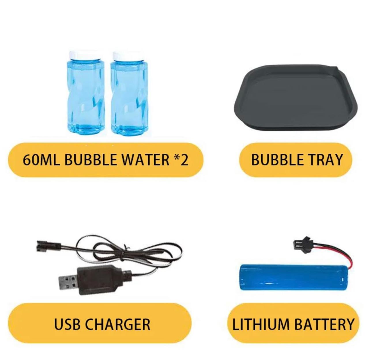 Contenido del paquete: - pistola - liquido para burbujas - batería - bandeja