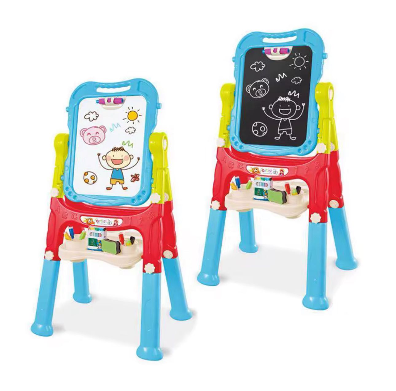 Pizarra de dibujo magnética de doble cara en blanco para uso de plumones  y negro para uso de tizas . De fácil armado. Incluye accesorios : plumones, borrador , tiza, vaso y magnéticos